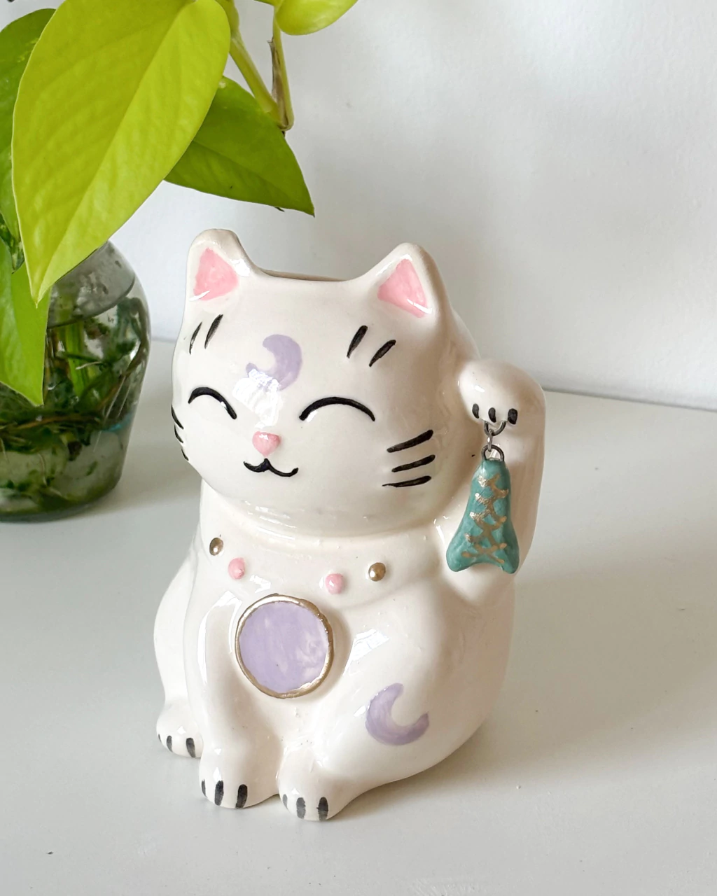 Florero de cerámica con dije de pez, detalles en dorado y agujerito para que le cuelgues lo que quieras! :)