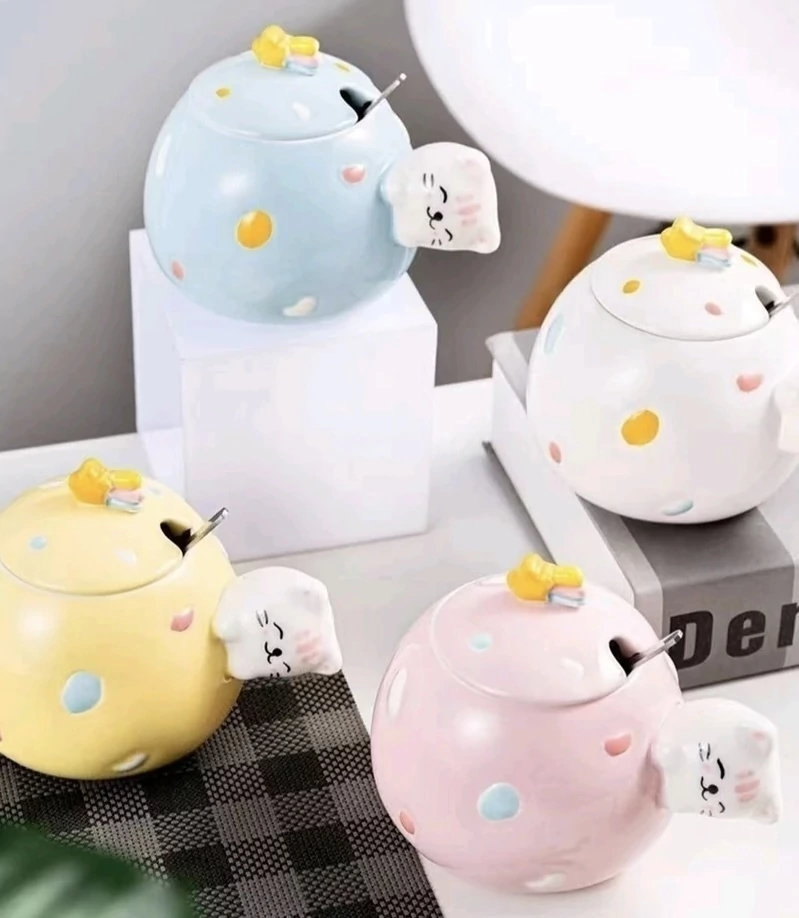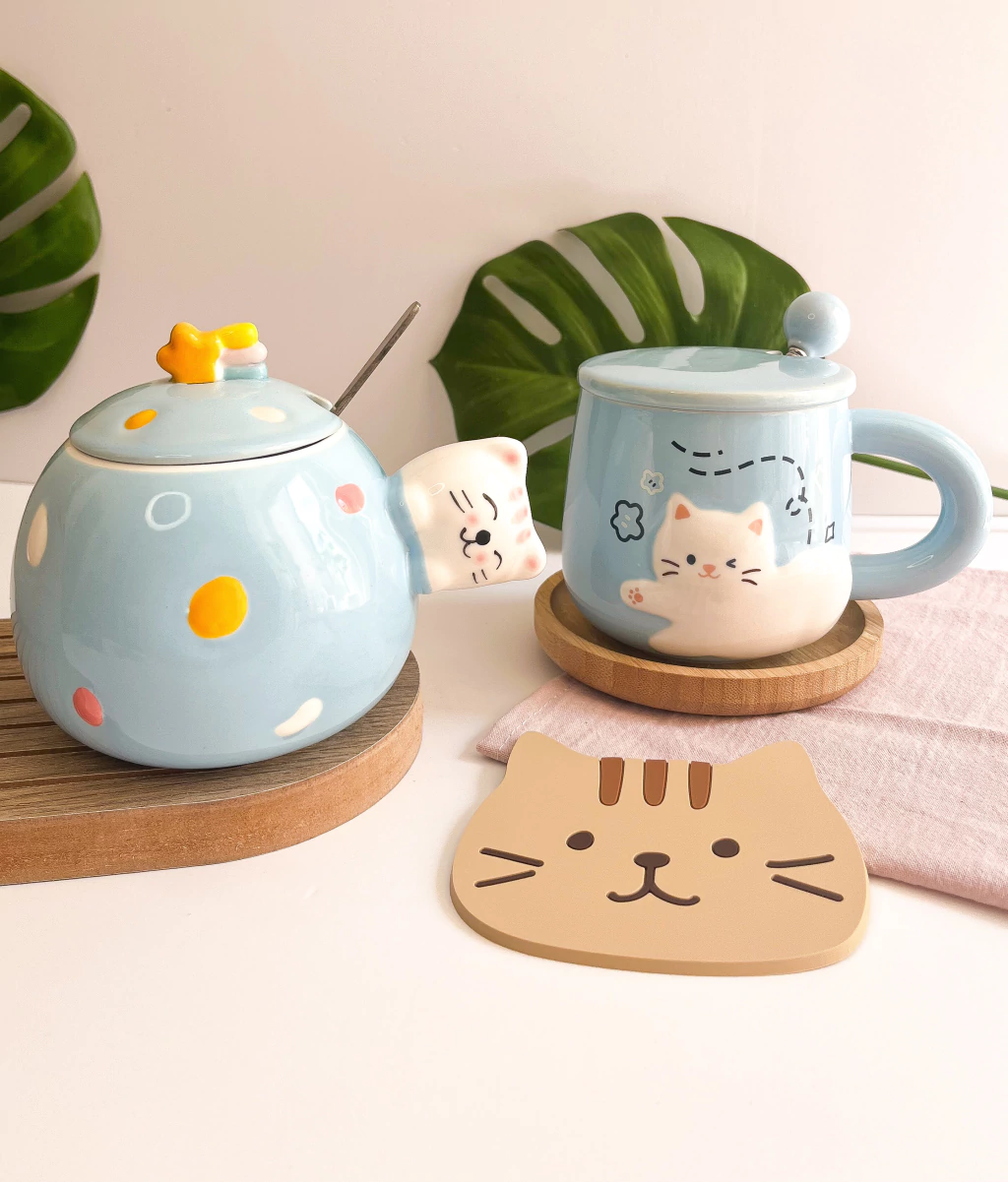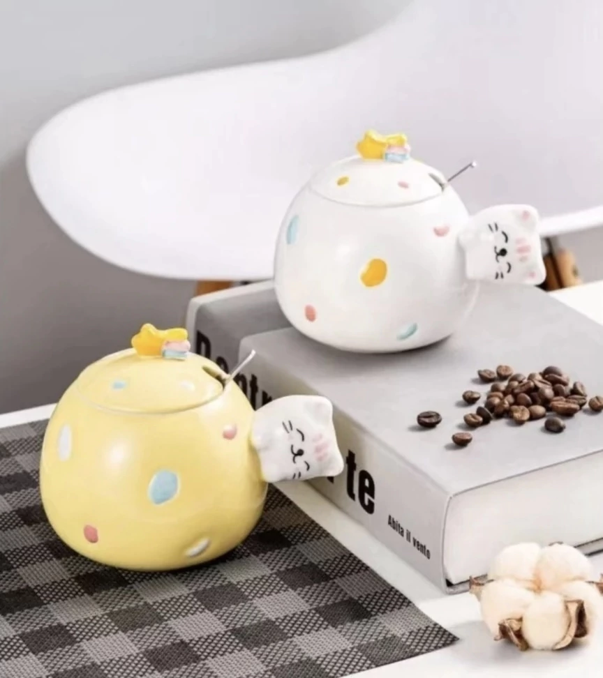 Taza de cerámica con detalles de colores y aplique de gatito en relieve. Incluye tapa con aplique de estrella fugaz y cuchara!